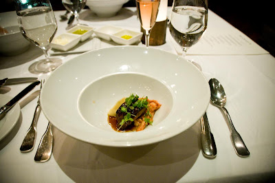 We decided to do the Chef's Tasting Menu so that we could try a little bit of everything. The menu consists of seven "tasting" courses that are predetermined by the chef. You can choose to do the Sommelier's wine pairing with each course, but we opted out of that and just had a single glass of wine..... Well, my dad and I did that.... My mom doesn't like wine (or really any alcohol for that matter....)