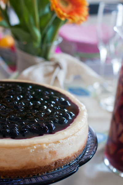 I had already planned to make a blueberry sauce to serve along side the cheesecake. Once the top cracked, I just revised my plan, thickened the sauce a bit more to make it more of a compote & spread it over the top of the cheesecake. Cracks covered.